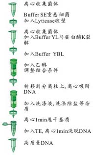 從正處于指數(shù)生長期的酵母培養(yǎng)液中收集細(xì)胞,菌體去除細(xì)胞壁,蛋白酶消化細(xì)胞,然后用GBC吸附柱吸附DNA,經(jīng)過兩次快速洗滌,最后將DNA溶解在滅菌水或低鹽緩沖液中。