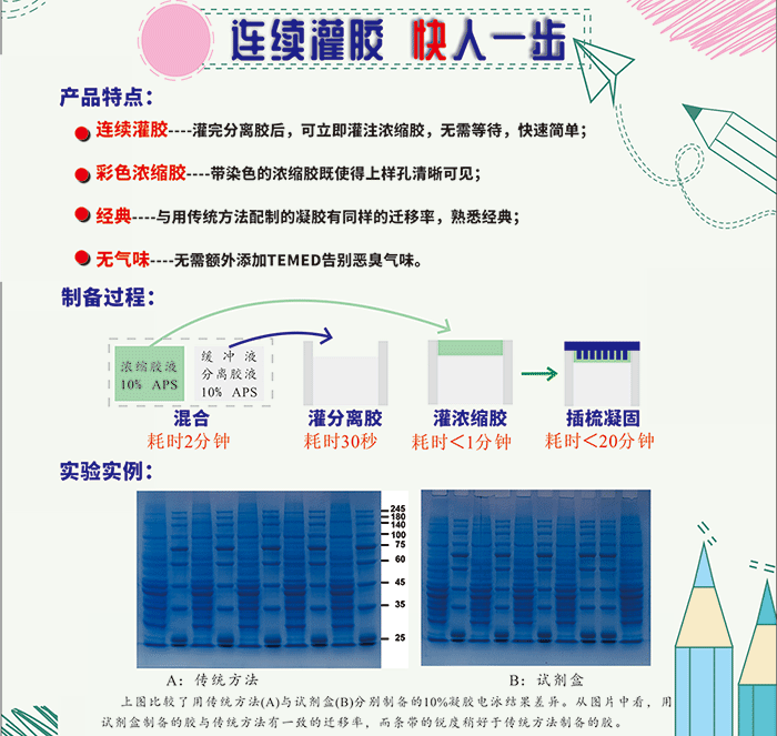 產(chǎn)品特點(diǎn): ※ 連續(xù)灌膠-----灌完分離膠后,可立即灌注濃縮膠,無需等待; ※ 彩色濃縮膠-----紅色的濃縮膠既使得上樣孔清晰可見,也在能監(jiān)測電泳與電轉(zhuǎn)狀況; ※ 經(jīng)典-----與用傳統(tǒng)方法配制的凝膠有同樣的遷移率,熟悉經(jīng)典; ※ 無氣味------無需額外添加TEMED,告別惡臭氣味。