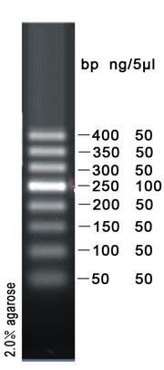 | 描述: | 50 bp ladder由50 、100、150、200、250、300、400、500bp 8條雙鏈線狀DNA片段混合而成,指示帶為250 bp。 | ||