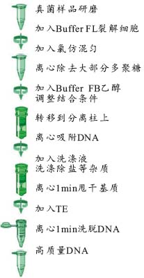 新鮮或干燥的真菌樣品(細胞)磨碎后,經(jīng)CTAB裂解液裂解,氯仿抽提去除多聚糖和其它影響下游應用的各種雜質(zhì),調(diào)節(jié)結(jié)合條件,轉(zhuǎn)移至GBC吸附柱中離心吸附DNA;兩次快速洗滌去除殘留的多糖類等雜質(zhì),最后用低鹽緩沖液洗脫DNA。