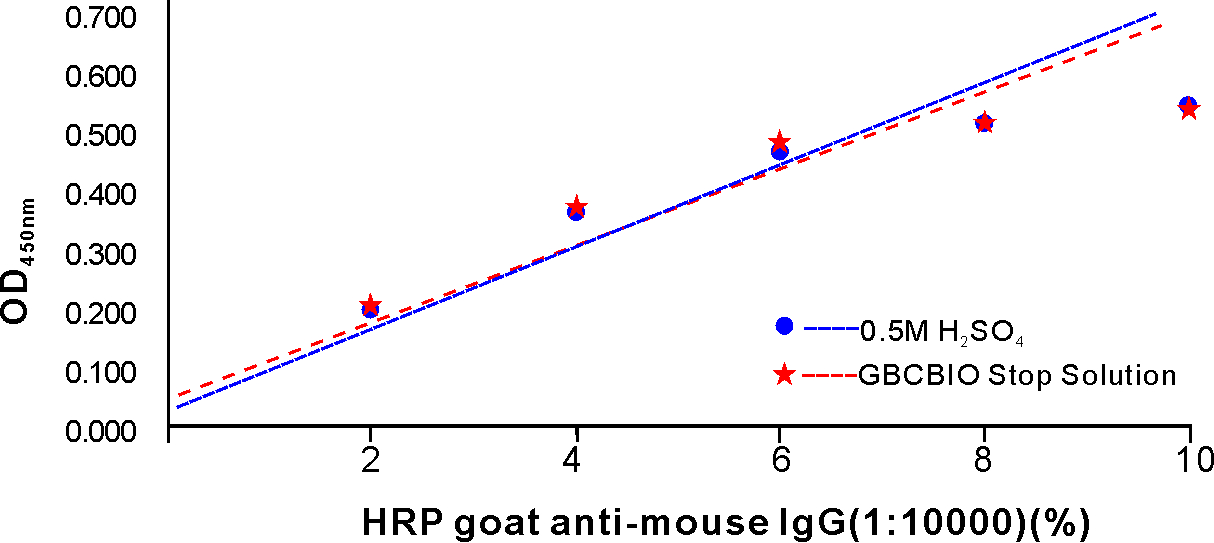 GBCBIO公司Stop Solution For TMB Substrate采用低腐蝕性的有機(jī)酸替代傳統(tǒng)使用2M硫酸作為TMB顯色的終止液,硫酸有強(qiáng)腐蝕性、且是管控危險(xiǎn)化學(xué)品難以購買得到,而本產(chǎn)品為低腐蝕性的有機(jī)酸可以有效避免硫酸的強(qiáng)腐蝕性可能對(duì)人體造成的傷害。需要注意的是本產(chǎn)品作為中強(qiáng)酸,雖然腐蝕性比硫酸弱很多,但還是有一定的腐蝕性,需要注意適當(dāng)防護(hù)。TMB顯色終止液(450nm, 不含硫酸)與傳統(tǒng)的硫酸終止液有一致的線性關(guān)系,操作方式也是一樣,是一種主要用于ELISA等實(shí)驗(yàn)中TMB顯色反應(yīng)終止的比較安全的不含硫酸的即用型酸性溶液。加入本產(chǎn)品后,TMB顯色反應(yīng)會(huì)被終止,并且原來的藍(lán)色溶液會(huì)并轉(zhuǎn)變成在450nm處有較強(qiáng)光吸收的黃色溶液,最終在450nm測定吸光度并且可以使檢測靈敏度比檢測藍(lán)色吸光度提高1倍左右。TMB,即3,3’,5,5’-Tetramethylbenzidine,是辣根過氧化物酶(horseradish peroxidase, HRP)的最常用底物之一。在辣根過氧化物酶或其它適當(dāng)過氧化物酶的催化下,TMB會(huì)產(chǎn)生可溶性藍(lán)色產(chǎn)物,該藍(lán)色產(chǎn)物通常可以在370nm或620-650nm測定吸光度。 由于辣根過氧化物酶與TMB的反應(yīng)在一定時(shí)間內(nèi)能持續(xù)進(jìn)行,若不及時(shí)終止反應(yīng),可能會(huì)由于反應(yīng)達(dá)到平臺(tái)期等而影響實(shí)驗(yàn)結(jié)果。TMB顯色終止液根據(jù)吸光度的檢測分為兩種,一種是在450nm進(jìn)行檢測,一種是在620-650nm進(jìn)行檢測。本TMB顯色終止液加入后溶液顏色從藍(lán)色變?yōu)辄S色,并在450nm測定吸光度,本產(chǎn)品終止反應(yīng)后在1小時(shí)內(nèi)吸光度保持穩(wěn)定。